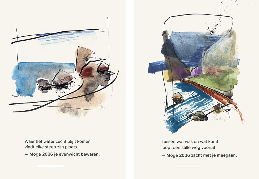 De Naturaleza-kaartjes ontstaan tijdens mijn wandelingen door het Vlaamse landschap. Ik schets en plein air, in de trein, onderweg. Maar vooral wanneer ik thuiskom na een inspirerende tocht, kan ik mijmerend nagenieten. Aan mijn tekentafel, met zachte muziek op de achtergrond, teken ik wat ik voel: lijnen die losschieten, kleurvlekken die ademen, de stilte tussen bomen, de geur van nat gras, een heuvel, een waterplas, weerspiegelingen op het oppervlak en wegen die oplossen in de verte.