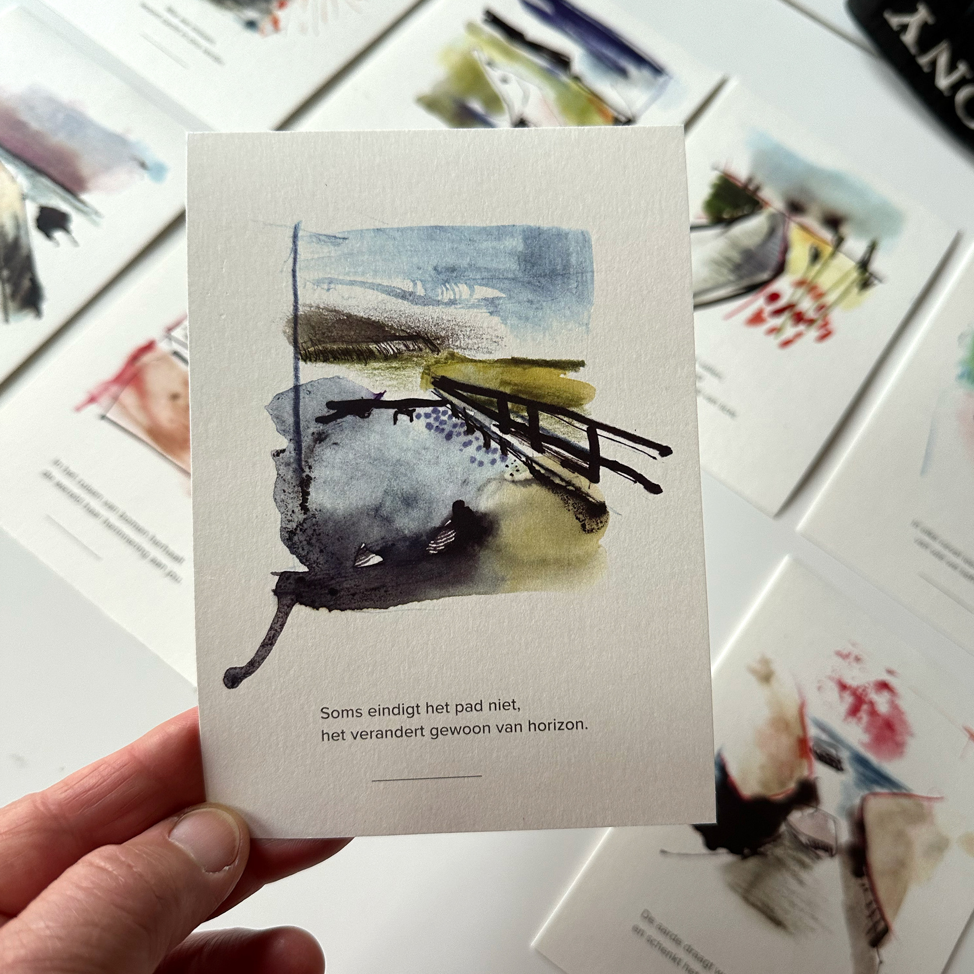 Elk kaartje draagt een kleine tekst, een fluistering van troost, een gedachte over tijd, herinnering of licht. Ze zijn bedoeld voor wie mist, voor wie zoekt, voor wie even wil verbinden. Voor families, vrienden, bewoners van rustoorden, of iemand die je graag zacht wil aanraken met woorden.